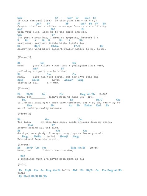 Alright, let’s break down Bohemian Rhapsody section by section, focusing on the lyrics and chord progressions. I’ll provide a simplified version of the chords that are commonly used, but keep in mind that the actual song has many layers and variations. It’s worth noting that the original key of the song is Eb, but for ease of playing, many guitarists prefer to play it in C or a similar key. Here, we’ll use chords that are relative to the key of C.