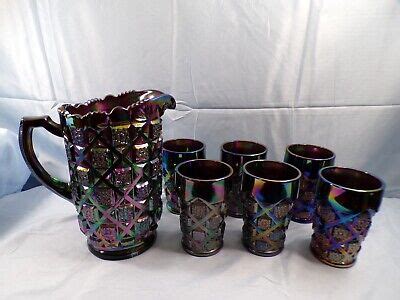 Online marketplaces offer a huge selection of carnival glass , allowing you to browse from the comfort of your home. However, it’s essential to do your homework. Read the seller’s feedback to assess their reputation. Carefully review the item’s description and photos, paying close attention to any flaws or damage. Look for clear, well-lit photos that show the iridescence and pattern of the piece. Research the pattern and manufacturer to ensure the piece is authentic. Auction sites can be exciting, but be prepared to bid competitively. Set a budget and stick to it. Online resources, such as collector’s guides and websites, can provide valuable information on patterns, manufacturers, and values. Join online forums and groups dedicated to carnival glass. These communities can offer advice, buying and selling opportunities, and a chance to connect with fellow collectors. When buying online, always ask the seller for additional photos or information if you have any questions. Consider using a payment method that offers buyer protection. Be aware of shipping costs and ensure the seller packages the item securely. With a little research and caution, you can safely and successfully add carnival glass pitcher sets to your collection.