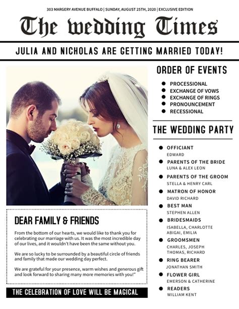 Designing your newspaper wedding announcement is where couples can truly let their personalities shine, turning a simple notice into a beautiful, personalized keepsake. Think of this as your opportunity to craft a mini-storyboard of your love, using visual elements to complement the heartfelt words. The aesthetic choices you make, from layout to typography, play a huge role in how your announcement is perceived and remembered. When considering layout ideas , you have a spectrum from ultra-traditional to strikingly modern. A traditional layout often features a structured, column-based format with a formal heading, perhaps a classic border, and a black-and-white photo. This exudes timeless elegance. For couples aiming for a more contemporary feel, you might explore cleaner lines, more white space, and a more editorial, magazine-like approach. Some even opt for a vintage newspaper template, making their announcement look like a front-page headline from decades past, which can be incredibly charming and unique. Experiment with different section breaks and perhaps a subtle graphic element, like intertwined initials or a small floral motif, to add visual interest without cluttering the space. The key is to create a balance between information and aesthetics, making it both easy to read and visually appealing.