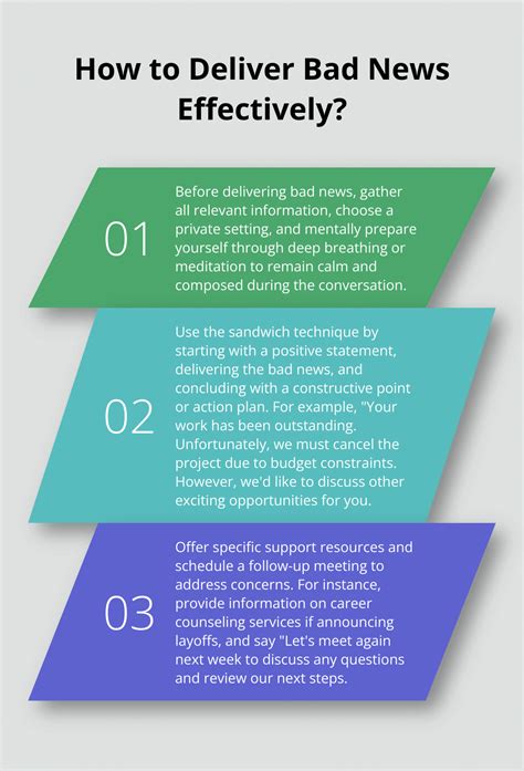 Okay, so we’ve covered empathy and honesty. Now, let’s talk about the magic of framing . This is where we really get to shine in how to say bad news in a positive way , guys. Framing isn’t about tricking people or pretending the bad news isn’t bad. It’s about presenting the information in a context that allows for a more constructive outlook. Think of it as putting a positive spin on a difficult situation without being disingenuous. The first step in framing is to focus on what can be done , rather than dwelling solely on what can’t. Even in the worst situations, there are often steps forward, lessons learned, or alternative paths. Highlight these possibilities. For example, if a project is canceled, instead of just saying, “The project is canceled,” you could frame it as: “While the ‘Project Alpha’ initiative will not be moving forward as planned due to [reason], we’ve gained invaluable insights into [specific learnings]. These insights will directly inform our strategy for the upcoming ‘Project Beta’, allowing us to achieve [specific positive outcome] more efficiently.” See how that shifts the focus from the loss to the future gain? Another framing technique is to emphasize the benefits or the rationale behind the decision , even if those benefits aren’t immediately obvious to the recipient. Sometimes, tough decisions are made for the greater good or for long-term sustainability. Explain this rationale clearly. For instance, if layoffs are necessary, you might frame it as a strategic decision for the company’s long-term health: “To ensure the company’s continued growth and stability in a challenging market, we’ve had to make some difficult organizational changes. While this means some roles are being eliminated, it positions us to invest more heavily in [growth areas] and secure our future.” This doesn’t negate the pain of the layoff, but it provides a reason that goes beyond arbitrary cuts. Use future-oriented language . Instead of dwelling on the past or the current negative state, talk about what comes next. “This setback means we’ll need to adjust our timeline, but it also gives us the opportunity to refine our approach and ensure a stronger final product.” This pivots the conversation from a dead end to a new beginning. Identify lessons learned . Every piece of bad news, every failure, offers a learning opportunity. Pointing these out can help the recipient feel like something positive, even if small, can be salvaged from the situation. “Although we didn’t achieve the sales target this quarter, the campaign provided crucial data on customer preferences that we can use to significantly boost performance next quarter.” Finally, offer solutions or support . Framing isn’t just about words; it’s about actions. If you can offer a solution, an alternative, or support during a difficult transition, that’s the most powerful framing you can provide. “While we can’t approve this loan application as is due to current financial criteria, I’d like to walk you through the steps you can take to strengthen your application for future consideration, and here are some resources that might help in the meantime.” Framing is an art, guys. It requires thoughtful consideration of the situation and the people involved. By focusing on solutions, lessons, and future possibilities, you can deliver even difficult news in a way that fosters resilience and understanding, rather than despair.