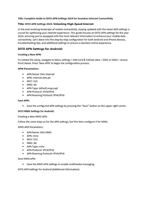 Are there other fields? You might see fields like ‘MMSC’, ‘MMS Proxy’, ‘MMS Port’, and ‘MCC’/‘MNC’. For basic internet access with DITO on your iPhone, you typically don’t need to configure these. Leave them blank unless DITO provides specific instructions for them, usually related to MMS (Multimedia Messaging Service). The primary focus for getting your data working is the APN field.