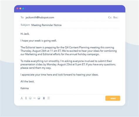 Be Clear and Concise: Get straight to the point. State what you need to remind the person about quickly and clearly. Avoid unnecessary fluff or ambiguity. Time is precious, so don’t waste it with unnecessary stuff.