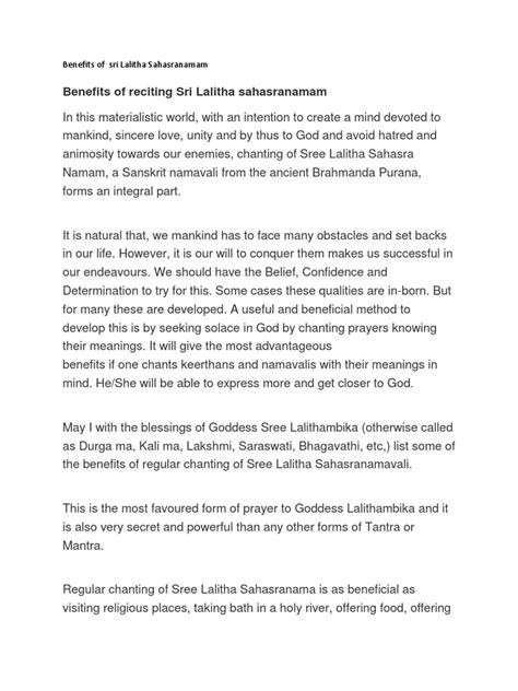 Hey guys! Ever heard of the Lalitha Sahasranamam ? It’s this super powerful and beautiful hymn dedicated to the Goddess Lalitha Tripura Sundari. Seriously, it’s a game-changer for anyone looking to deepen their spiritual practice or just find a little peace amidst the chaos of daily life. Let’s dive into what makes this hymn so special, its benefits, and what it all means!