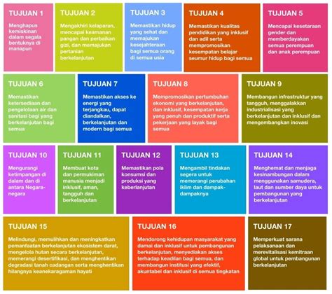 16. Perdamaian, Keadilan, dan Kelembagaan yang Kuat:** Mempromosikan masyarakat yang damai dan inklusif untuk pembangunan berkelanjutan, menyediakan akses terhadap keadilan bagi semua, dan membangun lembaga yang efektif, akuntabel, dan inklusif di semua tingkatan. Ini termasuk mengurangi kekerasan, memerangi korupsi, dan memperkuat supremasi hukum.