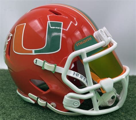Beyond the primary design elements, various subtle details contribute to the helmet’s overall appearance. These include the facemask design, which has evolved over time, and the use of stripes or other decorative elements. The facemask, once simple metal bars, now features more complex designs, offering enhanced protection and an updated look. Some helmets may include a stripe down the center, adding a touch of flair. The facemasks not only protect the players but also contribute to the unique identity of the helmet. The materials used in the helmet’s construction and its overall design are carefully chosen to ensure both safety and comfort for the players. The interior padding and the strap system are designed to offer a secure fit, minimizing the risk of injury. These details may seem minor, but they significantly impact the helmet’s overall functionality and appeal. Every feature of the Miami Hurricanes football helmet, from its colors to its logo to its materials, is meticulously designed to create an iconic symbol of the program’s rich history and ongoing pursuit of excellence.