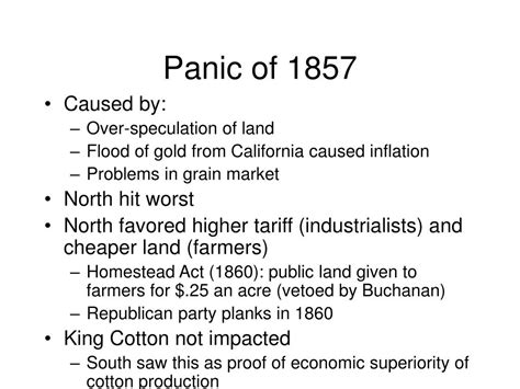 The Panic of 1857 highlighted the limitations of laissez-faire economics . The government’s hands-off approach to the crisis was widely criticized, leading to increased calls for government intervention and regulation. This shift in attitudes would have important implications for future economic policy, as the government gradually assumed a larger role in managing the economy. In summary, the Panic of 1857 was a watershed moment in American history, with far-reaching economic and political consequences. The crisis exposed vulnerabilities in the financial system, exacerbated sectional tensions, and influenced the political debates that would ultimately lead to the Civil War.