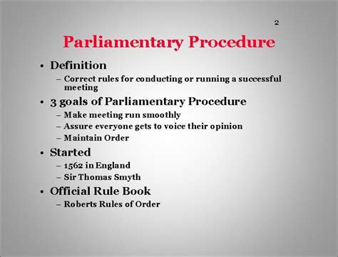 • Robert’s Rules of Order: This is the bible of parliamentary procedure . Consider getting a copy or accessing it online.