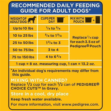 • Follow the Feeding Chart: Pedigree dry dog food comes with a feeding chart on the packaging. This chart provides guidelines on how much food to feed your dog based on their weight and age. It’s important to follow these guidelines as a starting point, but adjust as needed based on your dog’s individual needs and activity level.