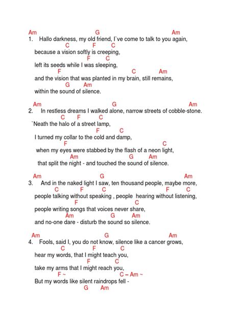 Understanding the song’s structure and how the chords fit together is key to playing “The Sound of Silence” authentically. Simon & Garfunkel were masters of crafting songs that felt both simple and complex, and this track is a perfect example. The song generally follows a verse-chorus structure, but with subtle variations that keep it engaging. Let’s look at the common progressions: The verses typically use a progression like Em - G - C - D . This is a very standard and pleasing progression that creates a sense of forward motion. You’ll hear this cycle repeat throughout the verses, building the narrative. Then, when you hit the chorus , the chords might shift slightly, or the intensity might change. Often, the chorus will still utilize the Em - G - C - D progression, but it’s the way it’s played – perhaps a bit more forcefully, or with a fuller strum – that differentiates it from the verses. However, some interpretations and live versions might introduce variations. For instance, you might hear an Am (A minor) chord appear, particularly in bridge sections or as a passing chord to add a different emotional flavor. The F chord, as mentioned before, can be a bit tricky. In many versions, you might see it appear as a transition, perhaps between C and G , or as part of a more complex progression. If you’re struggling with the F barre chord, remember you can often substitute it with an Fmaj7 (F major seventh) or even a simpler Dm (D minor) in some contexts, though this will change the flavor slightly. The key is to listen to the original recording and try to discern the harmonic movement. Pay attention to where the chord changes feel most natural and impactful. The song’s intro often features a distinct fingerpicking pattern or a sustained Em chord, setting the introspective tone right from the start. The outro usually fades out on the main progression, reinforcing the cyclical nature of the song. When you’re practicing, try to map out these sections. Play through the verse progression, then transition to what feels like the chorus progression. The beauty of “The Sound of Silence” is that even with a few core chords, you can create a vast emotional landscape. The subtle shifts in dynamics, the lyrical phrasing, and the harmonic movement all work together to create this incredibly powerful piece. Don’t be afraid to experiment slightly once you’ve mastered the basics, but always come back to the original structure to ensure you’re capturing the essence of this timeless classic. It’s this thoughtful arrangement of simple elements that makes the song resonate so deeply with listeners generation after generation.