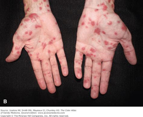 • Secondary Stage: A skin rash, often on the palms of the hands and soles of the feet. Other symptoms include fever, fatigue, sore throat, headache, and swollen lymph nodes.