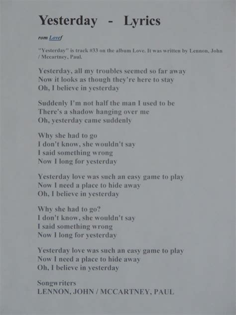 Hey guys! Ever found yourself humming along to a song and wondering what it actually means? Well, today we’re diving deep into one of the most iconic tunes of all time: “Yesterday” by The Beatles. We’ll be looking at the lyrics and translation , breaking down the meaning, and exploring why this song continues to resonate with so many people, even today. Get ready to explore the magic of Yesterday lyrics !